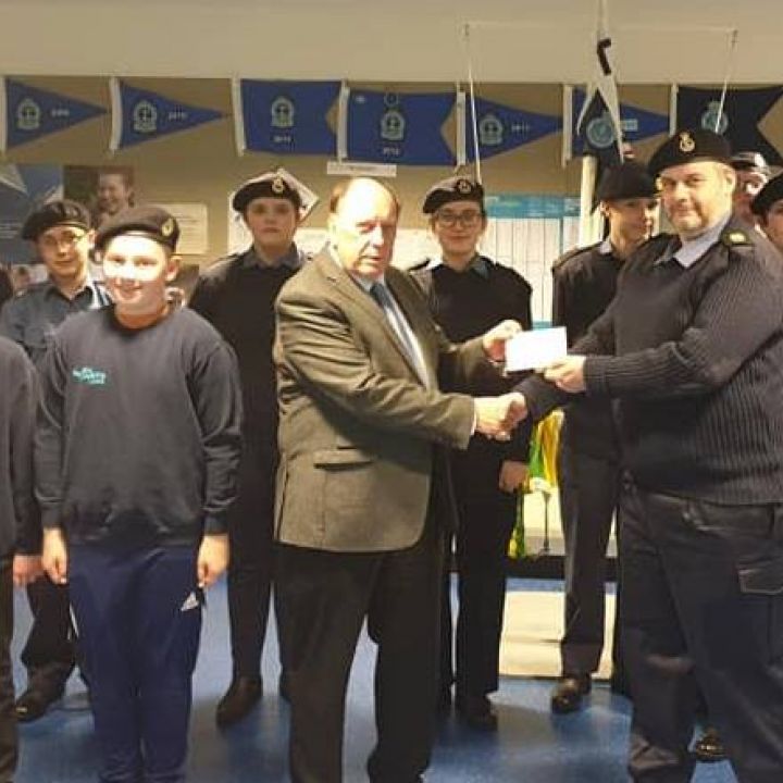 Community Council's Chairperson Alan Baker presented a cheque of £500 to the unit, as part of the Tangy II Windfarm Grant. We wish to thank the Council for this funding, which will be used towards the cadets training programme.