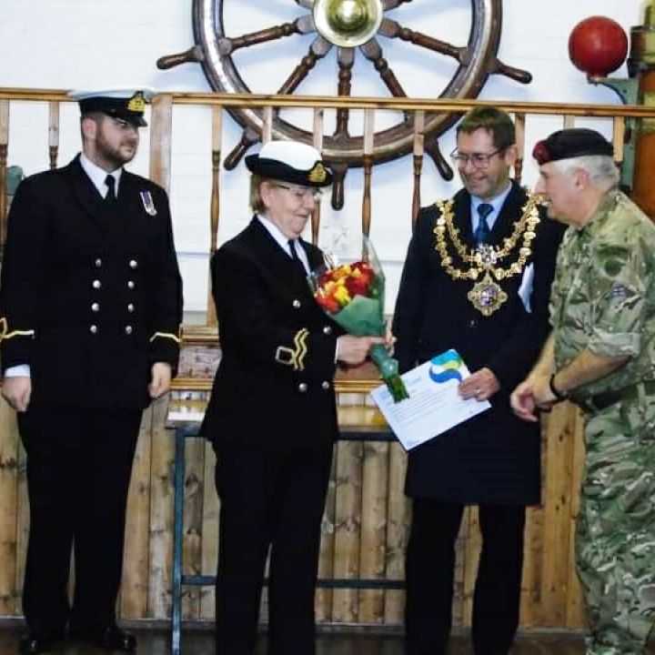 Lt. Jackie Gill receiving her 30 years service bar from Andy Abrahams, Executive Mayor of Mansfield on December 6th 2022.